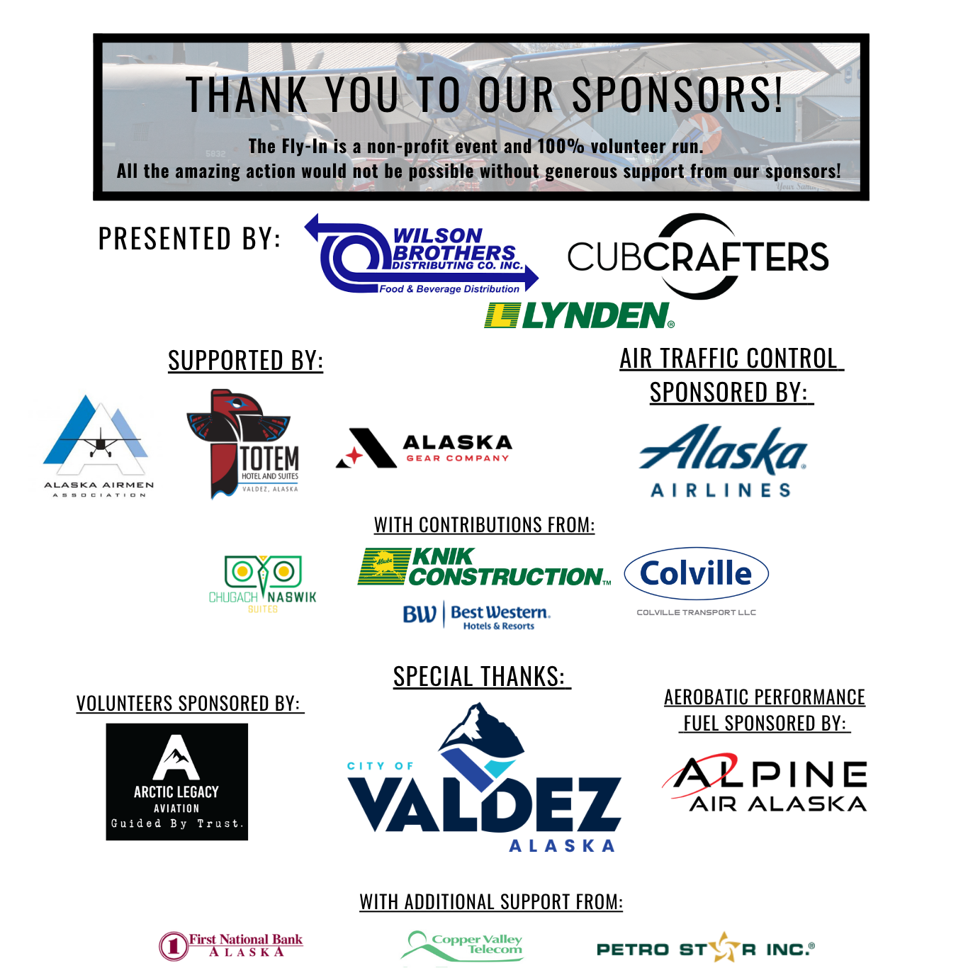 Thank you for your continued support and patronage. The Valdez community and the entire Alaskan Aviation community are grateful for your participation and allowing us to host the event for 22 amazing years. We're eager to once again share in the fun with our aviation family. See you in May!